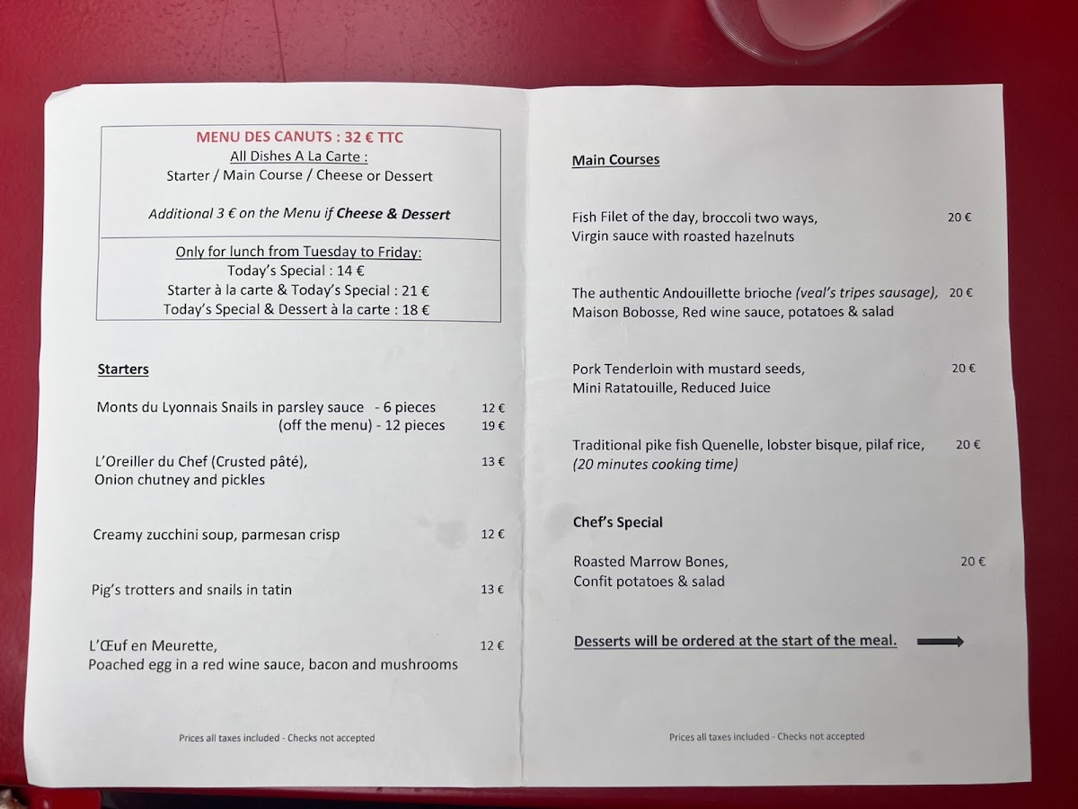 With main courses averaging around €20 and set menus at €32, sharing is encouraged to fully appreciate the diverse offerings. While the food may take some time to arrive, it's a testament to the authentic preparation that this establishment prides itself on. Each visit promises delicious food, good wine pairings, and a cozy ambiance – all hallmarks of a true bouchon.